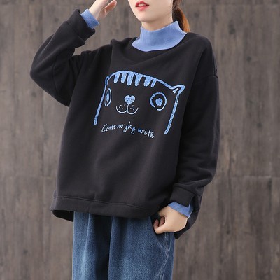 【绿素棉】2020秋冬 宽松休闲加绒大码 卡通高领卫衣女慵懒风上衣